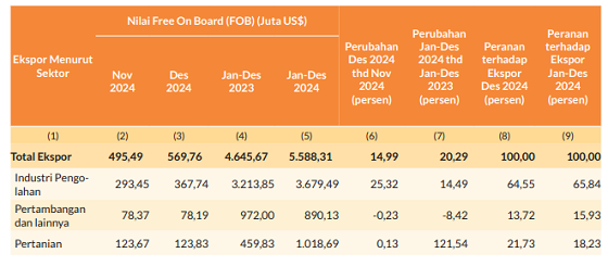 Per Desember 2024, nilai ekspor Provinsi Lampung mencapai 569,76 juta dolar AS, lebih tinggi dari nilai impor Desember 2024 sebesar 189,74 juta dolar AS.