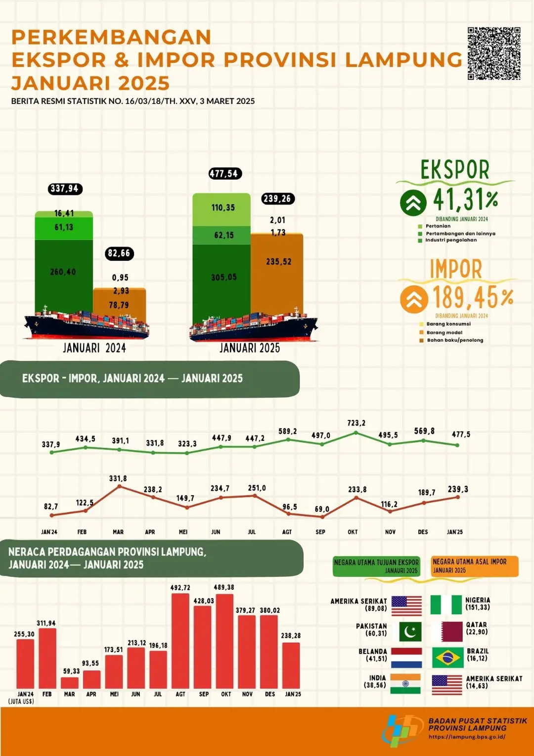 Bandarlampung (Progres.co.id): Nilai ekspor Provinsi Lampung pada Januari 2025 mencapai 477,54 juta dolar AS, mengalami penurunan 92,22 juta dolar AS atau turun 16,19 persen dibandingkan Desember 2024 yang mencapai 569,76 juta dolar AS.